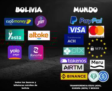 Hay varias formas de pago como con tarjetas debito/credito visa, mastercard,etc. Con tranferencias bancarias solo en bolivia, usa, mexico y europa. Con paypal, criptomonedas, PIX, y muchos mas.